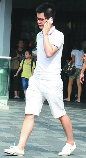这位可谓是绝对的白色粉丝儿,白色POLO衫+白色百慕大短裤+白色休闲鞋的搭配,干净清爽,再加上手机也是纯白的,更让他显得特别耀眼,浑身散发着阳光的味道,很有阳光男子的气质。