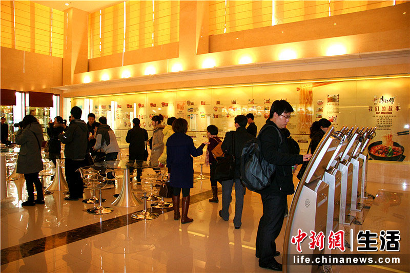 在美味体验吧中,分别设有品牌墙与历史墙,集中展示着康师傅方便面品牌的区域分布情况,以及自1992年起第一包康师傅方便面生产下线至今市场销售额占有率增至54.2%的二十年间企业发展历程。