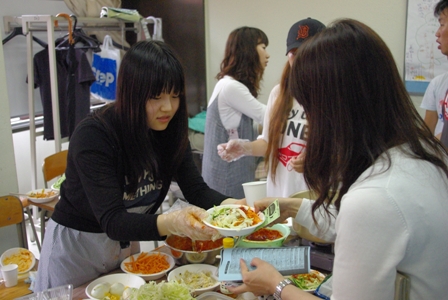 活动当天一大早,中国留学生就已经开始了如火如荼的准备。洗菜、准备食材、布置会场……为了能让来访的客人得到最好的体验,大家都一丝不苟地进行准备。翼路学园2号馆4楼主要是各国风味料理的品尝区。快到11点,整个楼层弥漫着各种食物的香味。其中的特色食品包括有春卷、饺子、炸酱面还有韩国冷面等。11点活动开始以后各种买卖声,吆喝声不绝入耳,非常热闹。大家也都排队耐心等待自己想要品尝的食物。2号馆5楼的内容比较丰富,有自由交易市场,各国的饮食文化介绍说明,中国的地域文化以及方言的说明。在韩国传统服饰的展览区,你不仅可以看到各种彩色的韩国传统服饰照片,还能实际穿上这些学生带来的传统韩国服饰,拍下照片,留下纪念。在表演日本的传统节目“落语”时,大家都聚精会神地听着台上绘声绘色的演出。