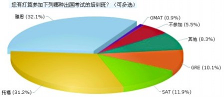 据相关报道,2009年中国托福考生人数较前年大幅增加30%,成为迄今参加托福考试的中国考生人数最多的一年。而随着世界名校认可度的提升,雅思的市场份额也日益加大。启德教育官方网在4月至6月间展开了“2010年中国首次中学生留学意向调查”,在本次调查中,选择雅思和托福考试培训班的基本持平,分别占32.1%和31.2%。数据统计结果如右图: