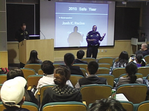 旧金山市警察局罪案分析专家John Racine、警督Reggie Hamilton、加州大学旧金山分校驻校警官Kennan Sievers等警方专家分别就当地的安全形式、海外学生安全的基本隐患及基本防范措施等做了演讲。圣荷西州立大学安全防卫术专家陈工教授向大家传授了防范应对各种犯罪活动的基本措施和技巧。