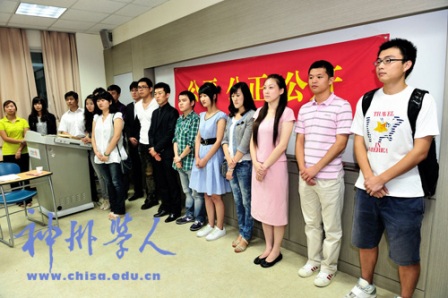 纳新活动采取的是“多对一”的集体面试方式。每位同学的面试时间大概是5-8分钟。包括同学的自我介绍,面试评审组的成员根据同学的意向进行针对性的提问,以此考察同学们的沟通能力,语言表达能力,以及应变能力。8位评审根据具体的评审标准对每位同学进行综合评分,然后根据各个部门需要人员的数量,按照平均分按从高到低的顺序进行选拔。