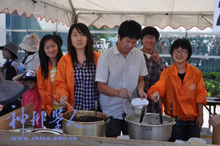 冈垣祭是冈垣町一年中最大的一次群众性集会,今年参加人数超过3万人。在会场的留学生们不仅和普通的日本人进行了广泛的交流,体验了纯正的日本茶道,还在会场的国际美食街中国美食摊位里和来自北九州市立大学的中国留学生黄臣、张宏晧等人联手合作为大家献上了一顿具有中国特色的炸酱面大餐,让大家一饱口福。
