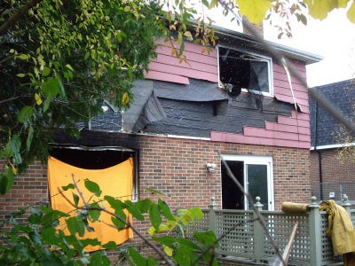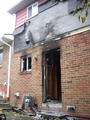 发生火灾的独立屋,除正门入口处上方屋顶均已被火熏黑之外,独立屋两侧及后方均已烧焦、门窗脱离散落,后方一大片焦黑无窗的大洞,只得临时以一大片布遮盖。