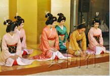 当日艺妓们给中国、土耳其 、菲律宾等国的5位女留学生穿上和服并给她们化妆,教授榻榻米的礼仪。最后留学生们穿着还不太适应的和服大方地给客人们行礼。