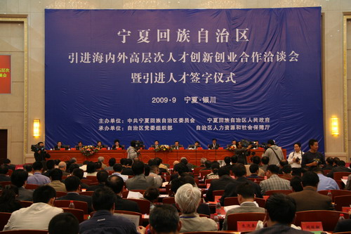 2009宁夏引进海内外高层次人才创新创业合作洽谈会9月7日下午在自治区首府银川召开。此次洽谈会聘27名院士、17名专家为“自治区特聘顾问”,宣布建立8家院士工作站和11家专家服务基地。自治区政府和一些单位与柔性和全职引进的专门人才签署了相关框架协议、共建协议和聘用合同等。