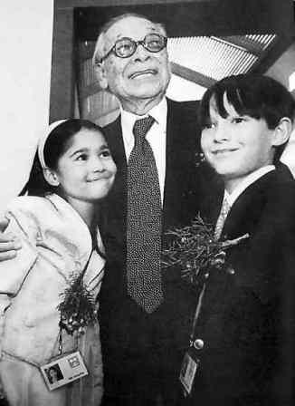 中秋佳节,贝聿铭携夫人、儿孙们,全家回苏州大团圆。典礼结束,老人陪同宾客参观新馆,恰巧遇到他的一对孙子女,他激动地一边搂住一个说:“来来来,拍张照留个念!”明月皎洁,桂花飘香,忠王府古戏台上,昆曲飘渺悠扬,次子贝建中携子、幼子贝礼中带女前来观看,可惜迟来一步,只好在过道红地毯上席地而坐。看着他们纹丝不动的背影,怎么不令人感动!尽管老人的儿孙在美国生长,不通中文,孙子是外国人相貌,但他们的根在苏州。