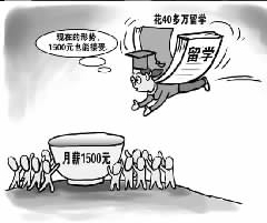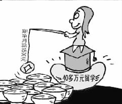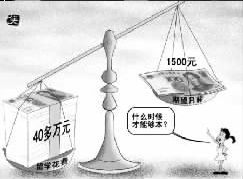 漫画四:新浪网贴出的漫画是一杆严重倾斜的秤,一头是40万百元大钞,一头是1500元大钞,题为“留学所花40多万元啥时才能赚够本?”的文字说明忧心忡忡:不吃不喝,想要赚回40万元得花20年。(万建辉)