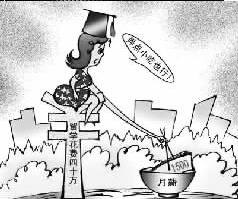漫画二:25日报道发出当天,署名李清的搜狐博客贴出题为“只要求月薪1500元的海归不丢人”的博文,配以头戴博士帽,以书为翅,勇敢飞向标有1500元月薪饭碗的海归漫画。
