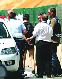 被告涉嫌要求乘坐署理侦缉督察的警车前往一处地点谈判,两名警员趁被告持刀的手放下时,立刻冲前,向被告面部喷辣椒喷雾,将被告制服及压在地上,然后扣上手镣,解往智朗警署。