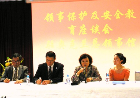 中新网11月30日电 据新西兰中华新闻通讯社消息,25日下午,中国驻奥克兰总领馆在签证大厅举办了一场华人及留学生领事保护安全座谈会。廖菊华总领事主持会议,工党华人国会议员霍建强、国家党黄徐毓芳部长助理郑楠,以及特别邀请的三位华裔新西兰警官出席了座谈会,他们先后就如何强化华人在新西兰的法律及自我保护意识进行讲座。