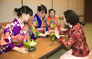这一天,山形大学的10名中国女留学生与来自山形县的20位致力于日中友好事业的朋友们一起交流。中国女留学生们穿上鲜艳的和服,在日本朋友的指导下用心体验插花与茶道文化的奥妙。