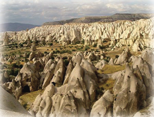 卡帕多奇亚位于土耳其安那托利亚(Anatolia)的腹地,在历史上有很长一段时间与世隔绝,不通音信。在这里,自然的伟大力量锻造出了世上独一无二的神奇地貌。这种地貌的形成起源于几百万年前Erciyes、Hasandag和Golludag三座火山的喷发。喷出的大量岩浆冷却、钙化,凝固成的风化岩层具有良好的可塑性,易于受腐蚀。之后,较耐腐蚀的玄武质火山岩覆盖了松软的风化岩层。随着时光的流逝,玄武质岩石碎裂,变得疏松,将松软的风化岩重又暴露出来。慢慢地,除了被玄武岩象伞一样遮盖起来的地方外,雨水把风化岩石侵蚀出一条条沟壑,形成了陡峭的神奇烟囱景观(fairy chimneys)。
