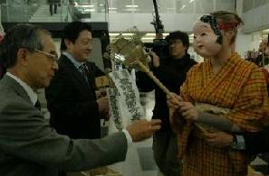 福冈市市长吉田宏也参加了撒豆的仪式。他认真地将一把豆子投进魔鬼手中的袋子,并从装扮成七福神的留学生手中接过了福冈市的象征物熊掌。
