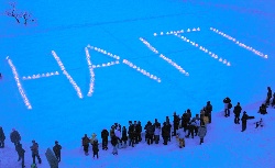 这次祝福祈愿烛火会是由国际大学的留学生会组织的。大家在校园内的一块空旷的雪地上用点燃的蜡烛拼写出一个大大的“HAITI”,并一起为在海地大地震中遭遇不幸的人们祈祷祝福,追悼亡灵。