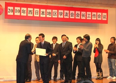 中国驻大阪总领馆张欣副总领事到会讲话,她对各位学友会会长积极进取和热情奉献精神给予高度赞扬,鼓励大家在新的一年继续努力,取得更大成绩。教育室主任刘占山向2009年学友会会长颁发了荣誉证书并发表讲话。他在讲话中充分肯定了西日本地区各学友会去年取得的成绩,并提出了要求。他说,2009年,我们迎来了伟大祖国的60岁生日,西日本地区广大留学人员身在海外,心系祖国,举办了一系列庆祝祖国生日的活动,表现出了强烈的爱国热情和一片赤诚之心。希望各学友会要继续团结广大留学人员,继续发扬热爱祖国、团结互助、刻苦学习、广交朋友的优良传统,以多种形式为国服务,成为中日友好的桥梁。