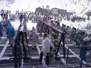 休息大厅前,大家都把滑雪器材放在这里,然后去休息。最近时兴滑板子,所以放眼望上去都是各色滑雪板。
