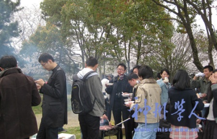 正午时分,同学们又回到赏花的大本营-----大濠公园樱花树下。“優しい”的学友会负责人员已经为大家准备好了烤肉用的器具以及各种饮料。大家自觉地分成三、五人一组,围着烧烤架边聊天边开始品尝自己动手制作的美食。