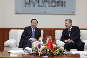 中新网4月13日电 据外交部网站消息,2010年4月9日,应现代起亚自动车集团邀请,张鑫森大使率领由中国驻韩国大使馆馆员、在韩留学生等200余人组成的“中韩友好产业考察团”访问了位于忠清南道牙山市的现代汽车牙山工厂。韩国国务总理室吴钧局长、知识经济部、教育科技部、外交通商部等部门官员出席了有关活动。