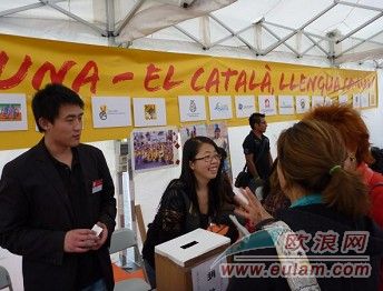 加泰罗尼亚语保护协会在SANT JORDI当天也组织了一系列的活动,这些活动也得到巴塞罗那中国学生学者联谊会的积极参与。23日早上在VILATOMAT 2号的某个公立小学里,巴塞罗那中国留学生黄星星、张志军、周子恒、项天宇、徐忱同学等人就积极参加他们的一系列活动。当天下午加泰罗尼亚语协会在市中心的大学广场搭建了临时活动地点,同时也给巴塞罗那中国学生学者联谊会一个宣传自己的“摊位”。热情的中国留学生们除了教过往的当地人及小朋友写中文名字以外,小书法家张志俊同学用中文写了一些字画,并剪裁成汉字“拼图”,让当地的小孩子们拼中文字,这些小孩子在玩乐之余,对中文产生了更加浓厚的兴趣,留学生们借着这个活动,在推加泰兰语影响力的同时也提高了中文的知名度。除此之外,中国留学生们不忘青海地震,还设立了专门的筹款箱,为青海地震筹款,在同学们的积极介绍下,路过的民众都投下或多或少的零钱或纸币,晚上活动结束的时候中国留学生为青海地震筹得捐款103欧元。