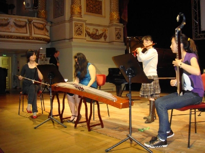 美国学生长号、圆号和小号齐奏爵士乐,欢快明亮;来自印度的大师舞台上席地而坐,双目微闭,两手挥洒自如地弹拨着西塔尔琴,其音如禅,清净流畅,高不可攀,尽显东方之神秘。中国乐曲则由四位在德国留学的中国姑娘用中国传统乐器二胡、琵琶、古筝和竹笛演奏,先是一曲《茉莉花》,清新畅快,再一首《喜洋洋》,生机勃然,欢快乐天,这座由著名建筑大师森帕尔设计、古典辉煌的欧式音乐圣殿内洋溢着中国风格的喜兴。中国姑娘演出完毕,全场观众热烈鼓掌,同学们三次谢幕。