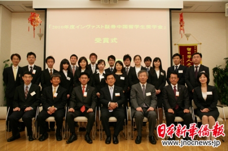 中新网5月18日电 据日本新华侨报网报道,5月15日,由日本英巴斯特证券株式会社发起的2010年度“中国留学生奖学金”颁奖仪式,在中国驻日本大使馆教育处隆重举行。中国驻日本大使馆教育处公使衔参赞孙建明、日本英巴斯特证券株式会社代表取缔役社长川路猛出席仪式并向获奖中国留学生颁奖。协助本次奖学金制度的施和获奖评选的《日本新华侨报》社社长吴晓乐、全日本中国留学生学友会的代表也出席了本次仪式。