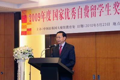 艾宏歌参赞介绍了“国家优秀自费留学生奖学金”设立的背景和颁奖情况。他说,自2003年实施以来,总共有1900余名在外优秀留学人员获奖。2009年度奖励规模达497人,其中在韩自费留学生13人获奖。他希望同学们牢记张大使的嘱托,奋发努力,为祖国的建设和中韩关系发展发挥积极作用。