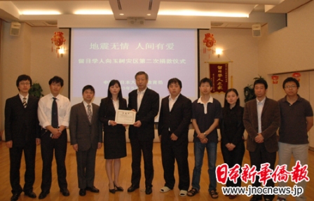中新网那个5月28日电 据日本新华侨报网报道,5月25日上午,全日本中国留学生学友会副会长韩冰以及东京大学、东京工业大学、早稻田大学、埼玉大学、东京海洋大学、千叶大学、日本大学等7所大学的中国留学生学友会会长和代表来到教育处,将留日学子为青海省玉树地震灾区募集的第二批赈灾款送到了教育处。第二批捐款总计日币2,861,295元、人民币1,000元。孙建明公使衔参赞代表教育处接受了来自留日学子的第二笔爱心捐款。
