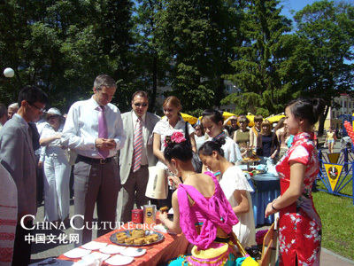 白俄罗斯文化部长拉杜什科先生在格罗德诺市市长陪同下专门来到中国展位,观看书法展示并品尝了中国茶,他还将第8届“民族文化节”的象征物——城市钥匙赠送给使馆文化处官员并发表了热情洋溢的讲话。拉杜什科先生高度评价了近年来两国文化交流所取得的成果并对中国留学生艺术团表示欢迎。