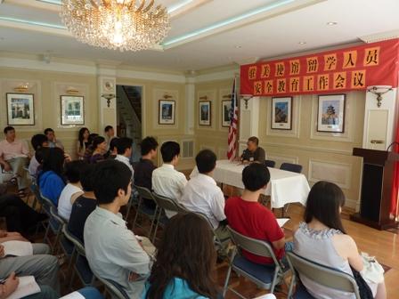 驻美使馆领事部陈雄风参赞在会议上介绍了领事保护协助的内容,希中国留学人员在美日常生活中,要从相互尊重、真诚相待、宽容大度、严于律已、把握分寸、尊重差异、积极融入、文明做人、心系祖国的态度出发,遵守法律,学会与人相处,减少安全隐患。他还介绍了在需要时,如何向中国外交机构提出领事保护协助申请的具体做法和要求。