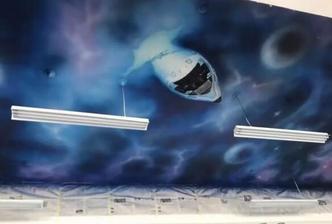 这幅在天花板上完成的星空图分为三个部分,一部分是由一个地球和一个黑洞组成,一部分是宇航员,还有一部分是一艘宇宙飞船。墙顶作画并不是一件容易的事,赵文瑞常常画到背心湿透。他说,“每次画画,下午胳膊就拿不起来,得用另一个胳膊推着这个胳膊去画。”