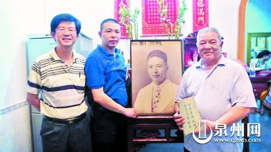 蔡清渊、蔡竟昭、林少川(左一)与珍藏的史料合影。 (林少川 供)