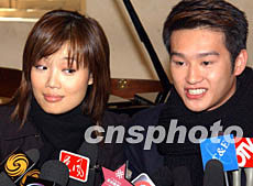 香港著名歌星容祖儿、2002年新秀冠军吴浩康一月十日在香港为新歌《他都不爱我》拍摄MTV。图为容祖儿、吴浩康接受记者采访。钱兴强 摄
