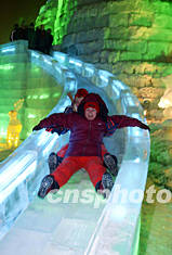两名外国游客沉醉于哈尔滨冰雪大世界冰滑梯的惊险乐趣。正在举行的哈尔滨冰雪节以奇特的冰、雪雕作品,吸引着众多中外游客。作者:毛建军
