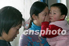 罹难矿工李景玉的女儿与外孙十五日在家中相拥而泣。