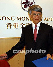 香港金融管理局总裁任志刚,一月十六日宣布香港外汇基金2002年业绩时表示,债券投资收益543亿港元,而股票却受全球经济负面影响估值亏损。潘索菲 摄