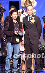 香港青年时装设计家创作表演赛2003,1月17日在香港时装节上举行,自由设计师马诗淇〔左〕作品荣获全场总冠军。洪少葵 摄