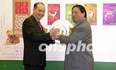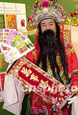 香港邮政署1月19日发行十二生肖(羊年)特别邮票,邮政署邀请财神展示羊年特别邮票首日封,并祝市民万事胜意。邓庆乐 摄