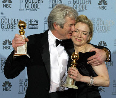 图为李察·吉尔(左)和芮妮·齐维格(右)分别获得音乐喜剧类电影最佳男、女主角奖。
