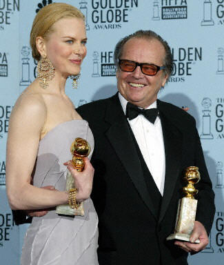 图为妮可·基德曼(左)和杰克·尼克尔逊(右)分别获得剧情类电影最佳女、男主角奖。