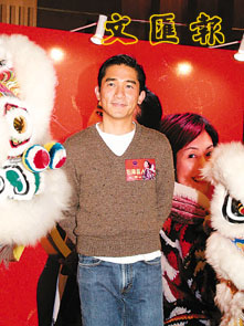 中新网1月24日电 贺岁片《行运超人》昨天在香港举行首映,梁朝伟偷空从《2046》的拍摄现场赶往出席,不过他为免戏中的造型曝光,先将二撇鸡须脱下才出现,他说这次的造型是他自己构思,想给观众有不同的感觉。