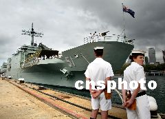 图:澳军士兵乘军舰驶离悉尼港开往波斯湾