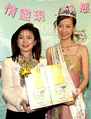 「2003年度国际华裔小姐竞选」获奖佳丽1月26日在香港出席赞助商颁奖仪式,应届国际华裔小姐冠军陈泳锦接受赞助商颁赠礼品。