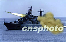 中央军委授予海军哈尔滨舰“海上先锋舰”荣誉称号命名大会二十六日在青岛某军港举行。海军哈尔滨舰是中国国产某新型导弹驱逐舰首舰。图为哈尔滨舰发射反舰导弹。作者:王松岐