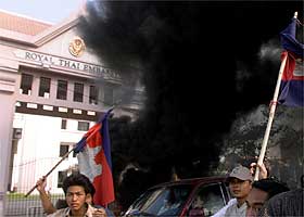 示威者焚烧了泰国国旗,并呼喊反泰口号。傍晚时分,人群聚集在泰国大使馆外。柬埔寨警察对天鸣枪,希望能够驱散人群。