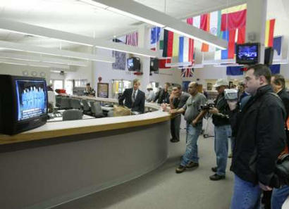 2月1日,记者们(右)在肯尼迪航天中心的新闻中心收听有关航天飞机的最新消息