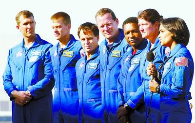 2003年2月1日,美国“哥伦比亚”号航天飞机在完成飞行任务返航途中解体爆炸。图为航天飞机上7名机组人员的全体照片,拍摄时间是2002年12月20日。从左到右为:里克·赫斯本德、威廉·麦库尔、伊兰·拉蒙、迈克尔·安德森、戴维·布朗、劳雷尔·克拉克和卡尔帕娜·乔娜。