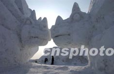 冰天雪地的长春净月潭为新春游览设立雪雕恐龙世界,营造北国侏罗纪传奇。作者:贾国荣