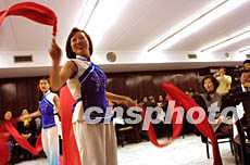 春节期间,美国芝加哥华人华侨相聚一堂,他们跳起红绸舞,过个喜气洋洋的中国节。作者:王瑶