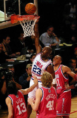 去年以状元秀身份加盟休斯顿火箭队的中国球员姚明,以首发身份为西部联盟全明星队出战。比赛刚开始,姚明就接到队友传球,扣篮成功,为球队贡献两分。在上半场,姚明上场10分钟,1投1中,2个篮板球,2分。